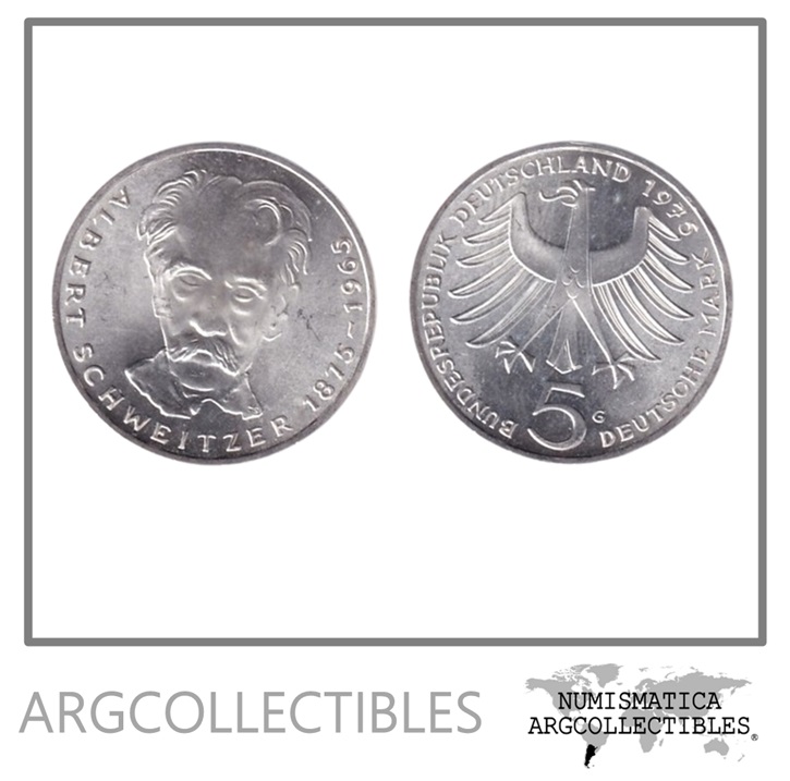 Alemania Moneda 5 Marcos 1975 Albert Schweitzer Plata 625 KM-143 UNC
