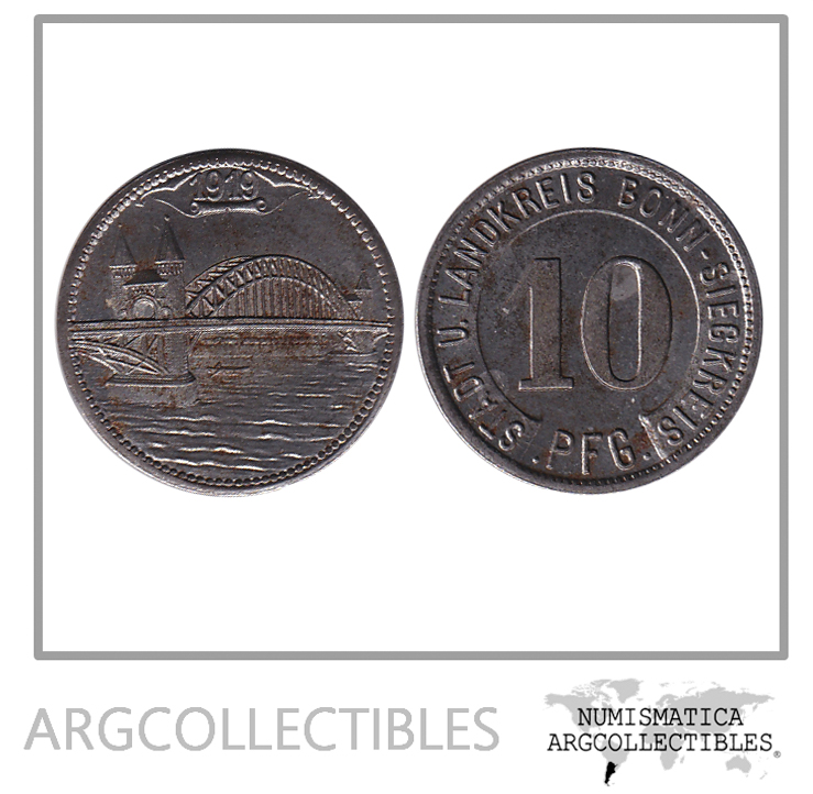Alemania Moneda Notgeld 10 Pfennig 1919 Stadt U Landkreis Bonn (42) Zinc