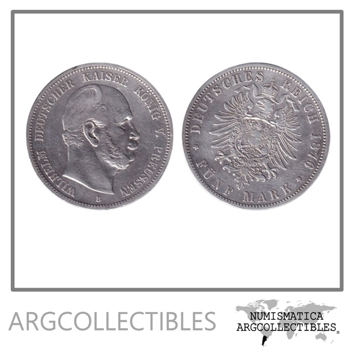 Alemania Prusia Moneda 5 Marcos 1874 B Plata 900 KM-503 VF+ (Guillermo I)
