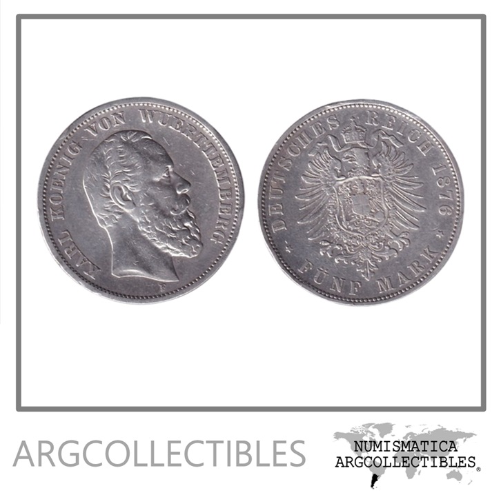 Alemania Wurttemberg Moneda 5 Marcos 1876 F Carlos I Plata 900 KM-623 VF