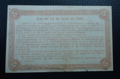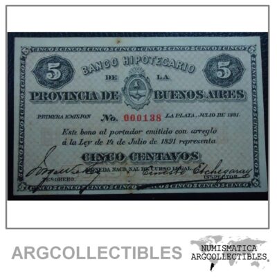 ARGENTINA Billete 5 Centavos, Pick S611 AU 1891 – Serial Bajo 000138