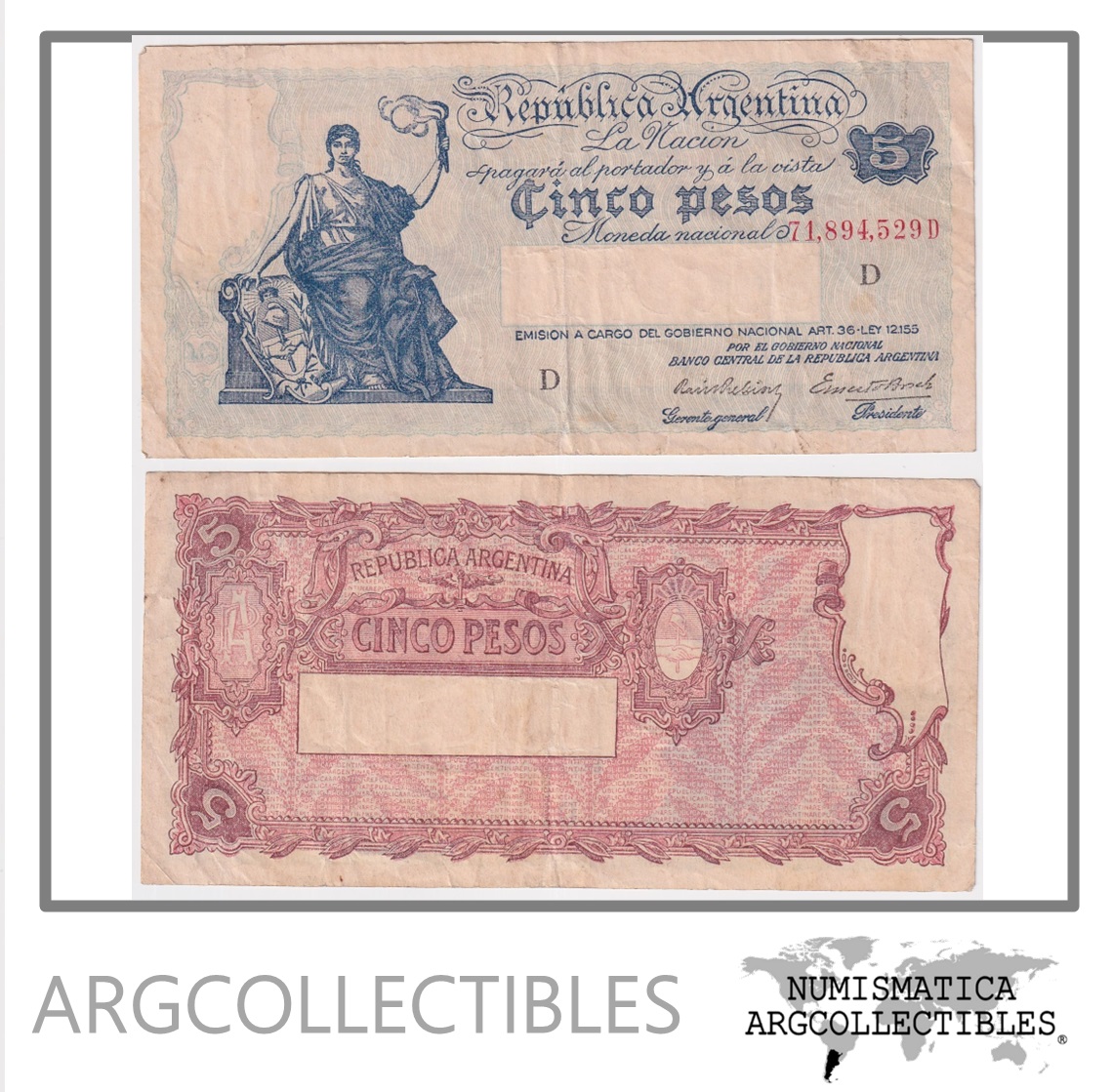 Argentina Billete 5 Pesos 1943 P-252a/BOT-1851 VF Serie D