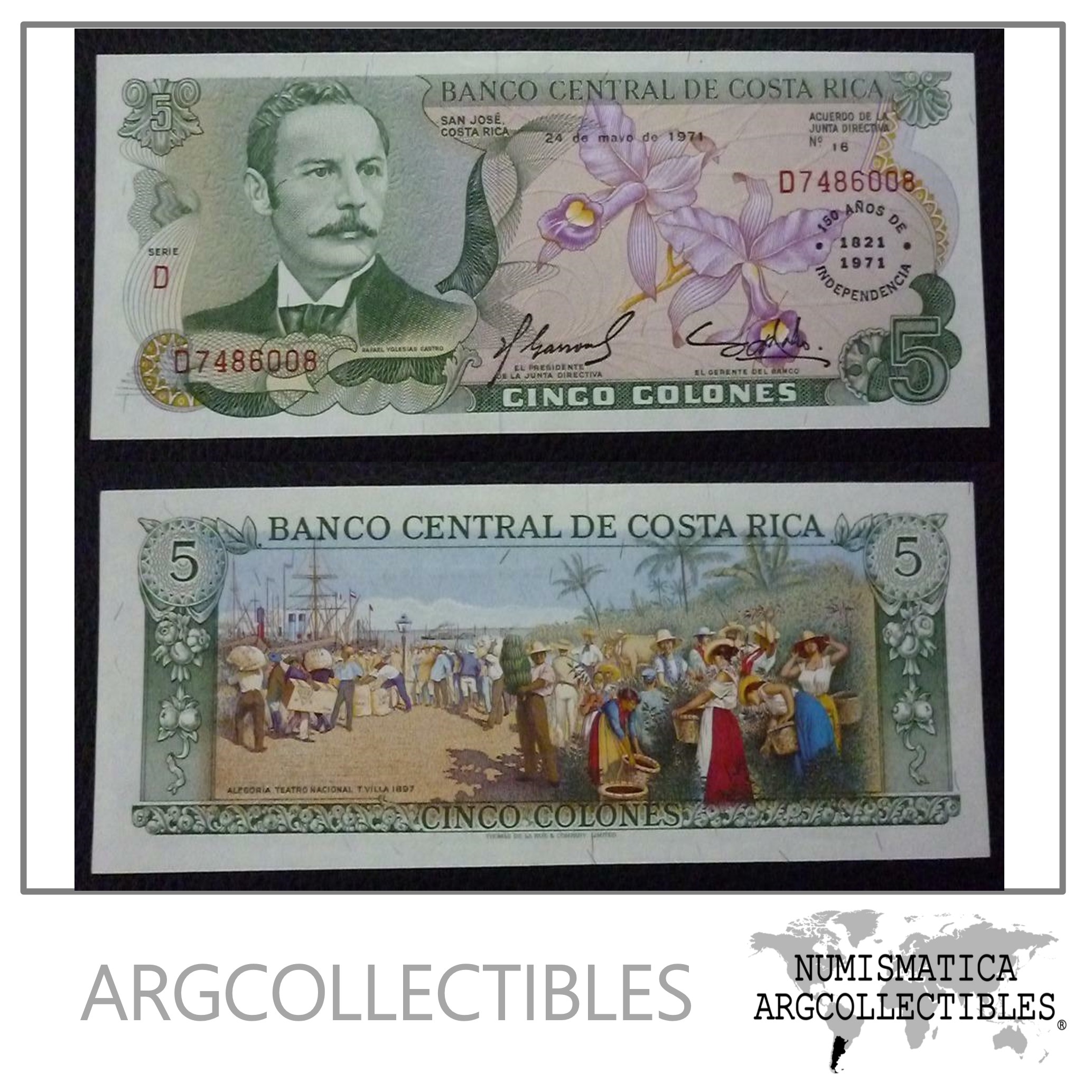 Costa Rica Billete 5 Colones, Pick 241 UNC 1971 (150th Aniversario Independencia)