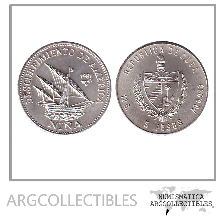 Cuba Moneda 5 Pesos 1981 Descubrimiento de America Barco La Niña Plata KM-71 UNC