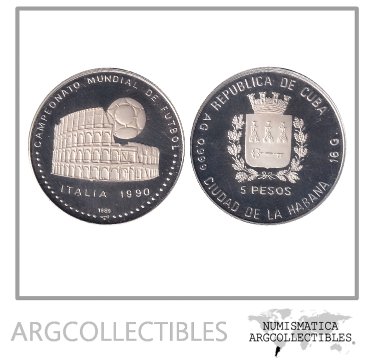 Cuba Moneda 5 Pesos 1989 Plata 999 Mundial Futbol Italia 90 Coliceo KM-226 Proof