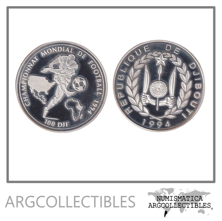 Djibouti Moneda 100 Francos 1994 Mundial de Futbol USA Plata 925 KM-29 Proof