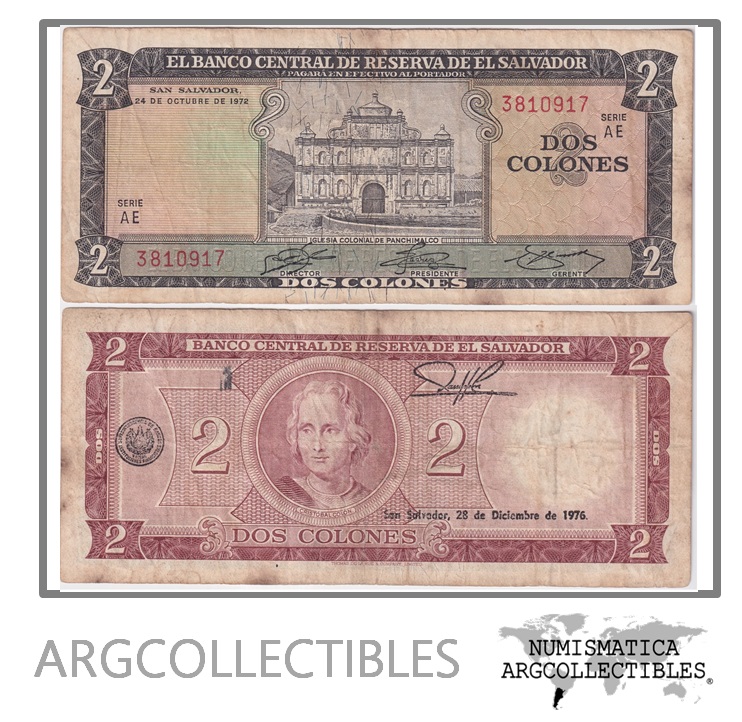 El Salvador Billete 2 Colones 1972 P-116a F+ (Serie AE)