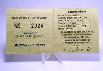 Francia Moneda 15 Ecu Plata 1991 Descartes KM-989 Proof