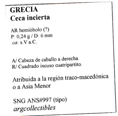 Grecia Moneda AR Hemiobolo Ceca incierta MA12