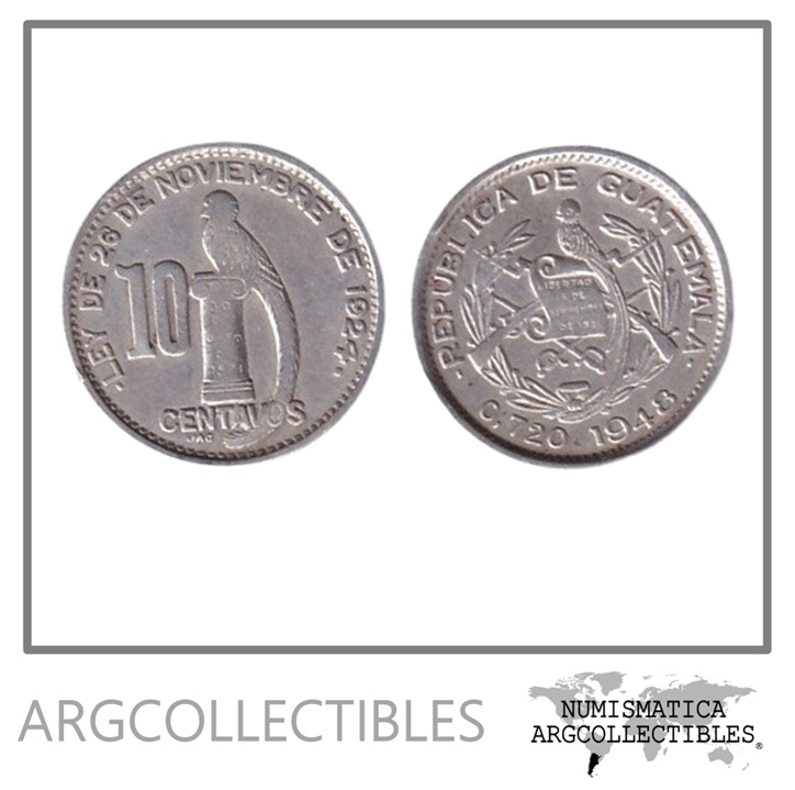 Guatemala Moneda 10 Centavos 1948 Quetzal Plata 720 KM-239 VF