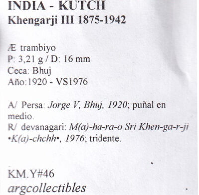 India Kutch Moneda Ae Trambiyo Khengarji III 1920 VS1976 KM-Y#46 MDA7