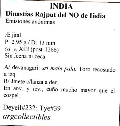 India Moneda Dinastias Rajput del NO de India Emisiones Anonimas Ae Jital MA37