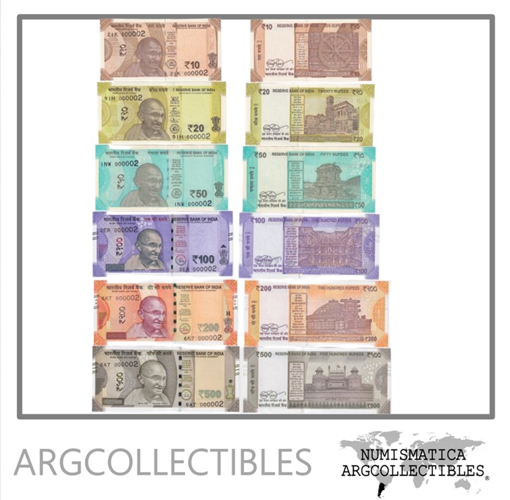 India Set 6 Billetes 10-20-50-100-200-500 Rupias 2018-2021 P-109/110/111/112/113/114 UNC (Numero Bajo)