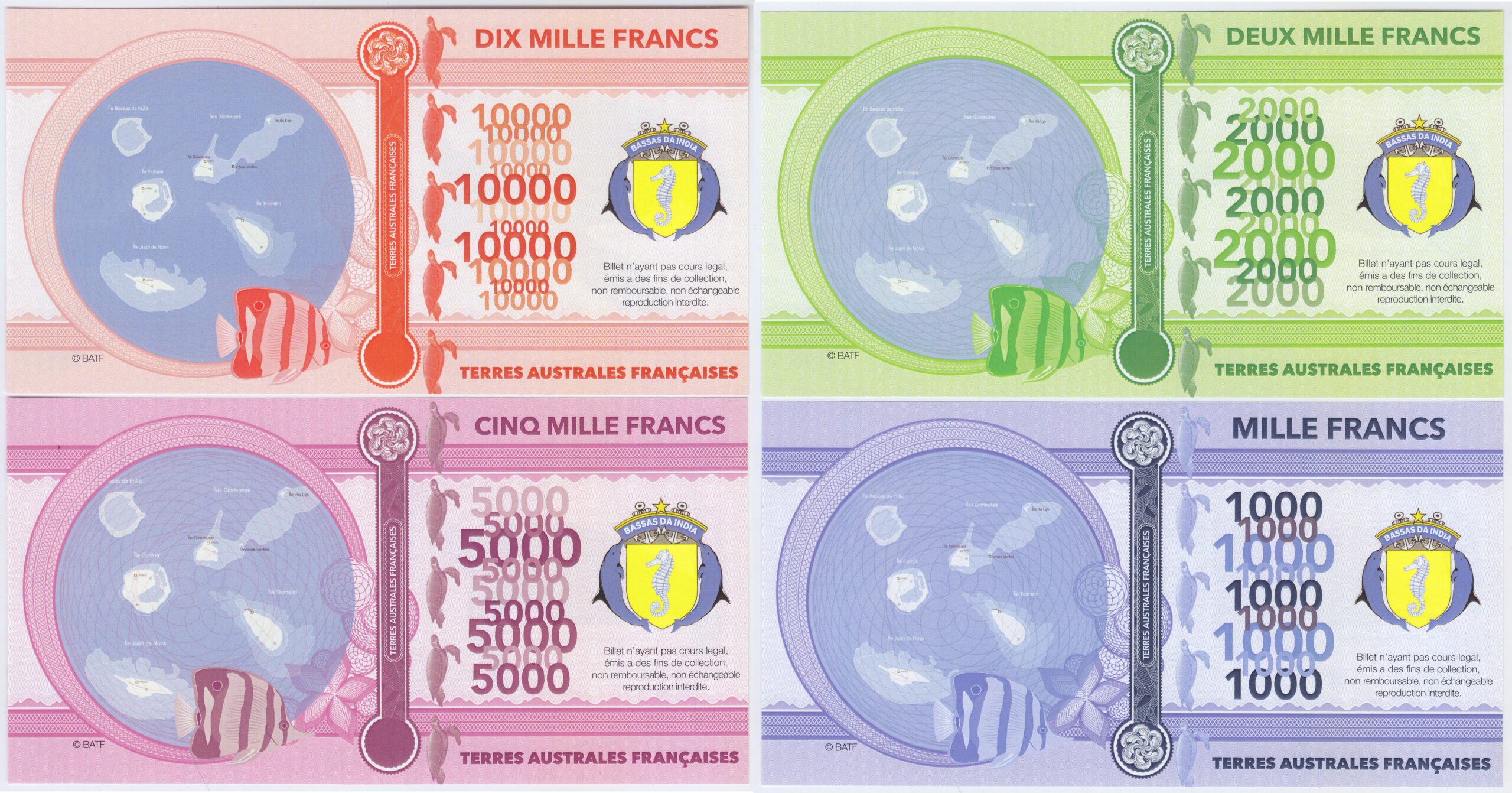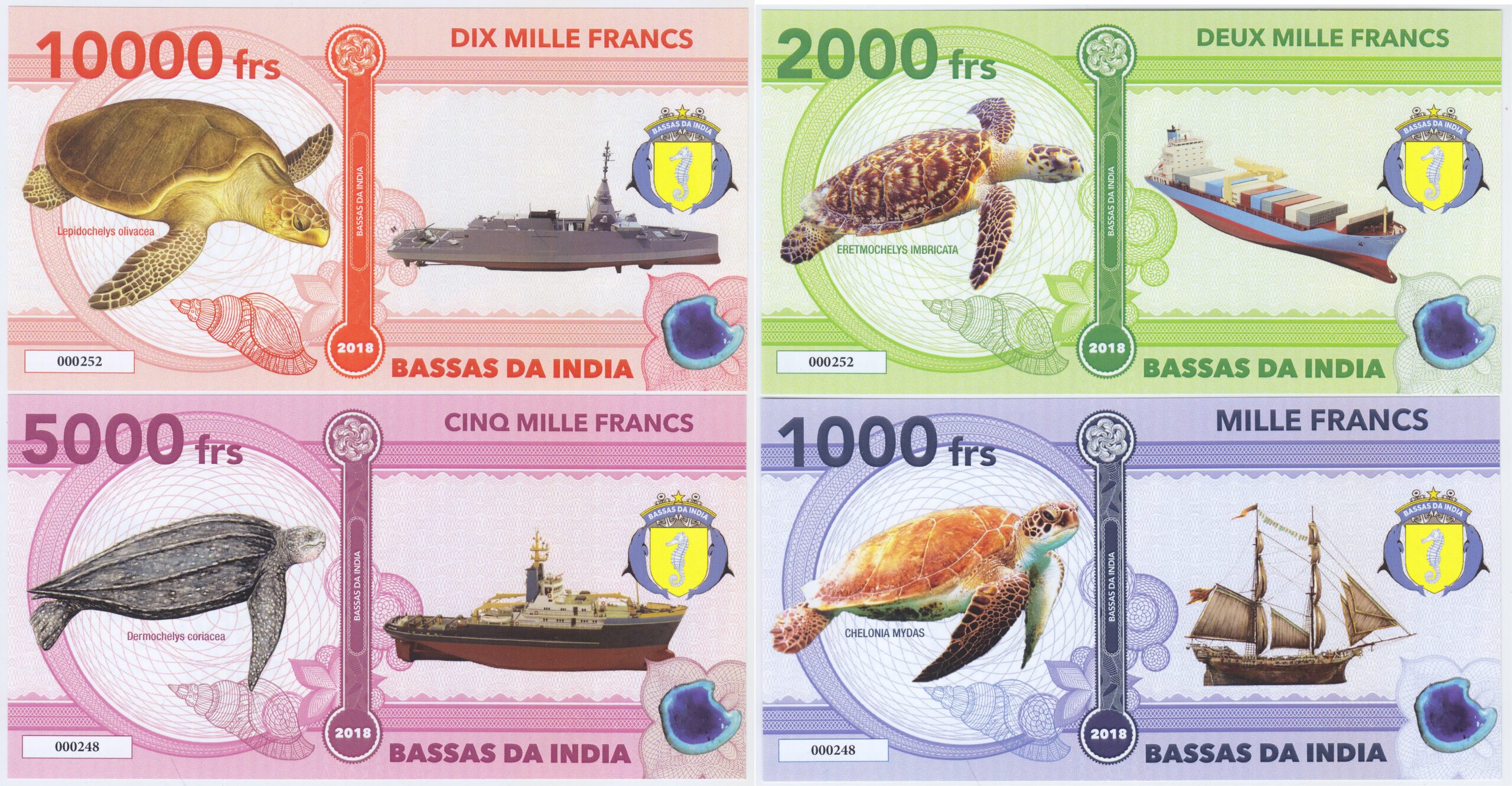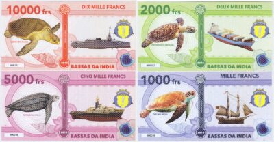 Isla Bassas de India Set 4 Billetes 1.000, 2.000, 5.000, 10.000 Francos 2018 Tortugas Unc