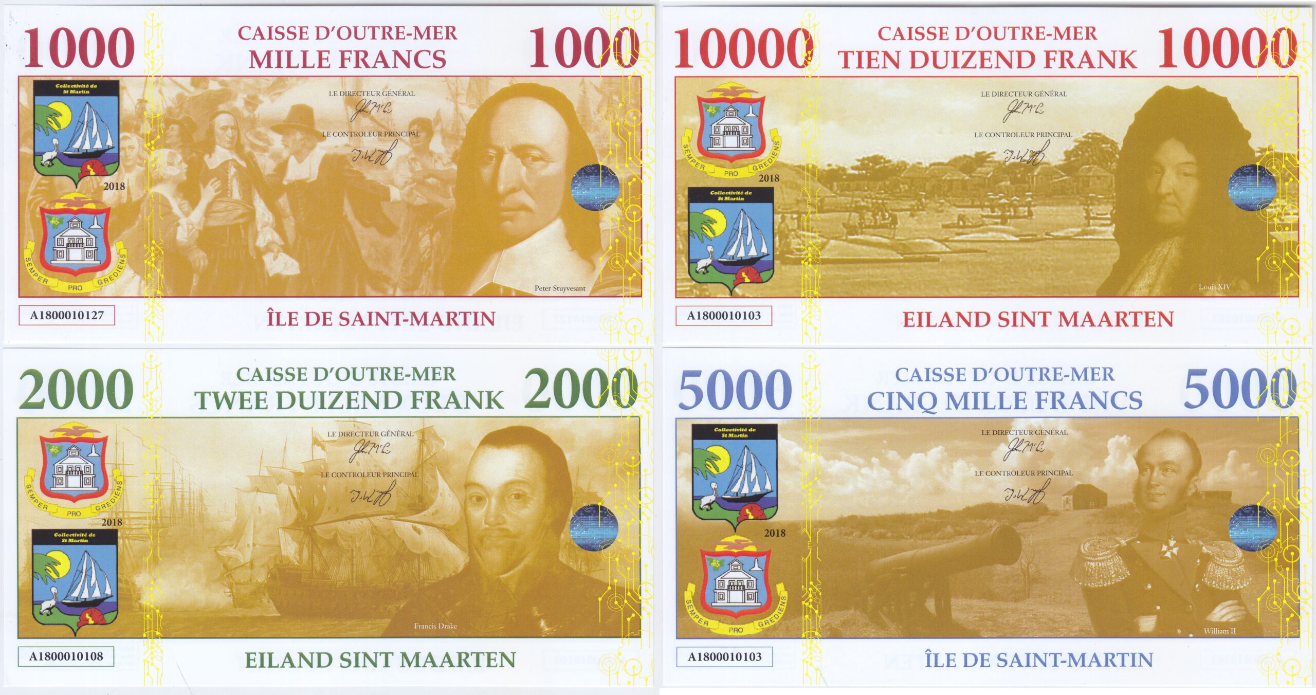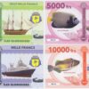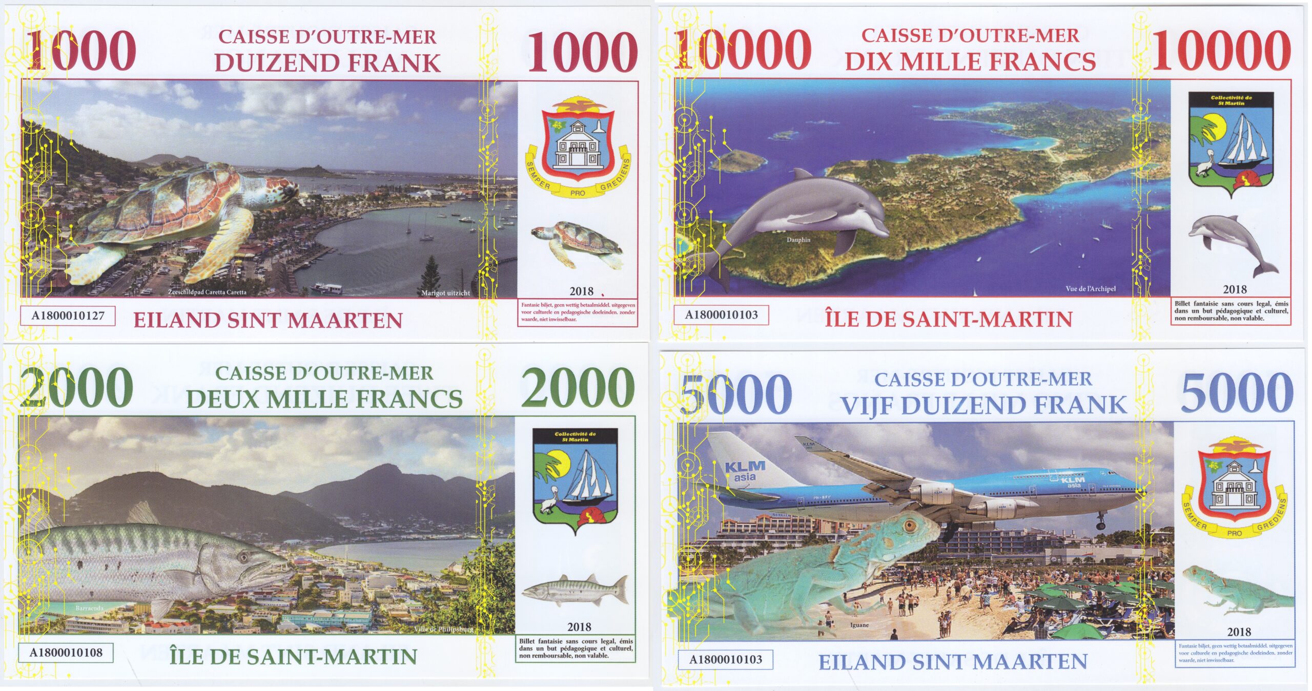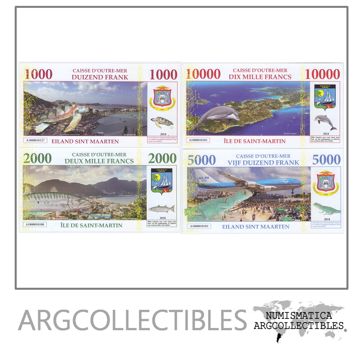 Isla San Martin Set 4 Billetes 1.000, 2.000, 5.000, 10.000 Francos 2018 Animales Marinos Unc