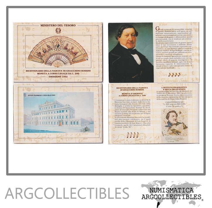 Italia Moneda 500 Liras Año 1992 Plata Bicentenario Gioacchino Rossini