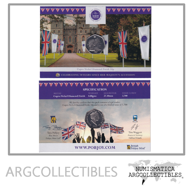 Malvinas Blister Moneda 50 Pence 2022 Niquel 70 Aniv Reina Isabel UNC