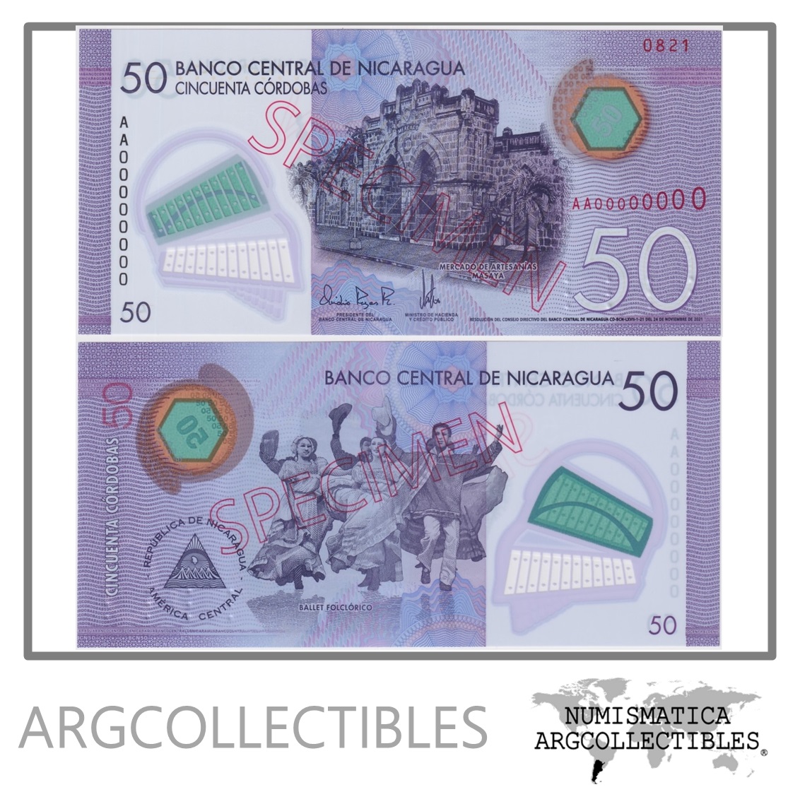 Nicaragua Billete 50 Cordobas 2021 P-211s UNC (Specimen)