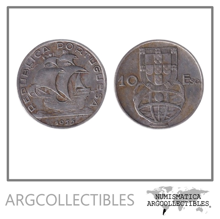 Portugal Moneda 10 Escudos 1955 Plata 680 Barco KM-586 VF+