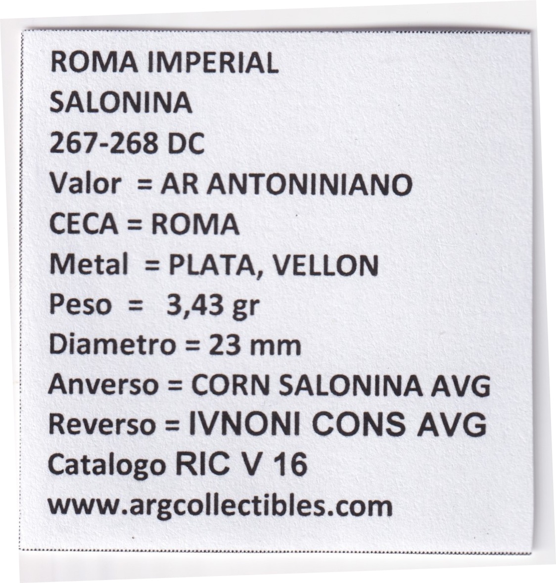 Roma Imperial Moneda Ar Antoniniano 267-268 Roma Salolina RIC-V16 RR4