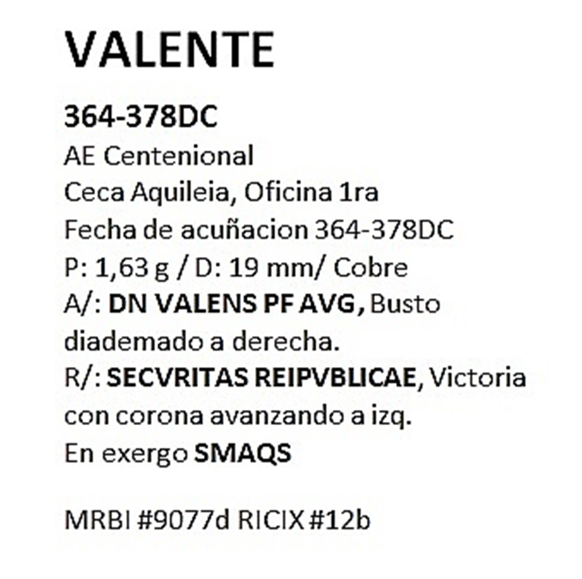 Roma Moneda Ae Centenional Valente 364/378 Aquileia Ofic. 1ra Bb11