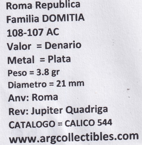 Roma Republica Moneda Denario 108 AC Familia Domitia Calico-544