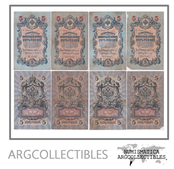 Rusia Billetes 5 Rublos 1909 P-10a F+/VF (Lote x 4 Firmas Diferentes)