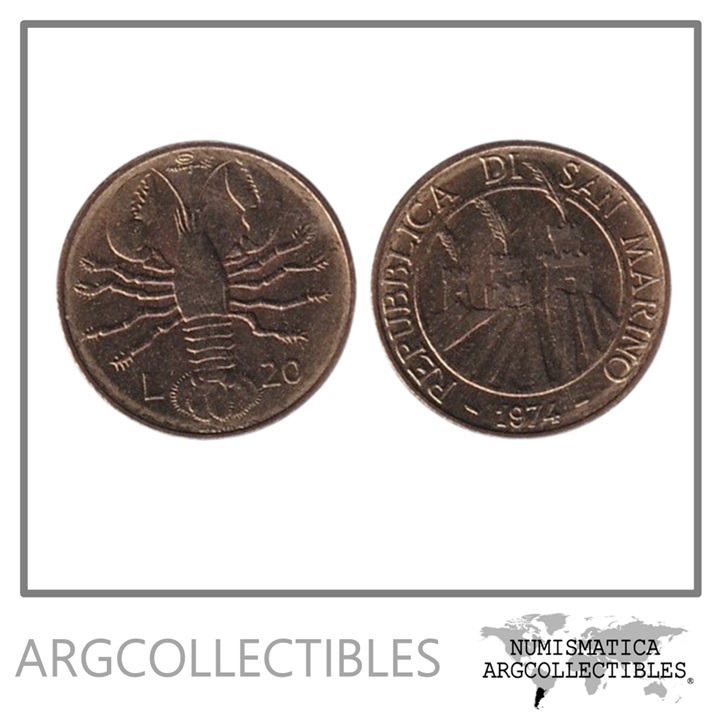 San Marino Moneda 20 Liras 1974 Cangrejo Laton KM-34 UNC