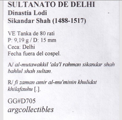 Sultanato de Delhi Dinastia Lodi Sikandar Shah 1488-1517 VE Tanka de 80 Rati GG#D705 MDA1