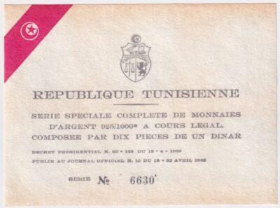 Tunez Set x 10 Monedas 1 Dinar 1969 Plata 925 194 GRAMOS P-S-3 KM-292/301 Proof
